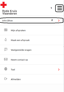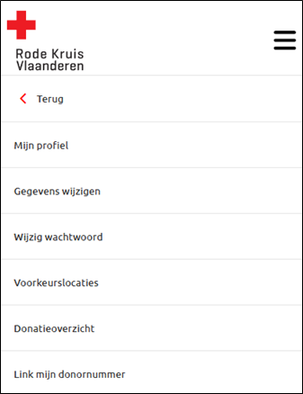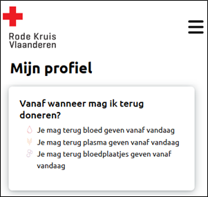 - Mon profil: vous y trouverez, entre autres, votre groupe sanguin, vos antécédents en matière de dons, votre statut de garde, votre lieu de résidence préféré et vos coordonnées. Vous pouvez modifier vos coordonnées ici, ainsi que votre lieu de collecte préféré (pour le sang, le plasma et les plaquettes).