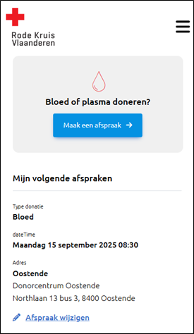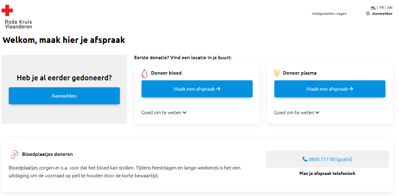 Le don dans nos centres de don ou lors d'une collecte mobile ne peut se faire que sur rendez-vous. Vous pouvez facilement prendre rendez-vous vous-même sur notre portail du donneur. Vous pouvez également consulter l'historique de vos dons et gérer vos données personnelles sur le portail des donneurs.