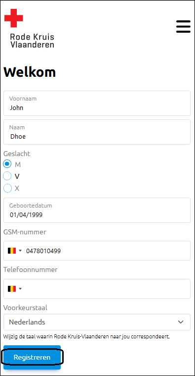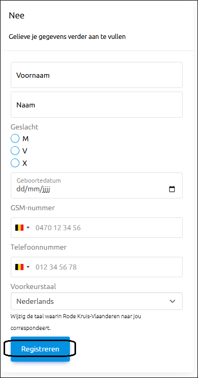 Lorsque nous vous reconnaîtrons comme donateur connu de la Rode Kruis-Vlaanderen, vos données seront affichées et, le cas échéant, vous pourrez encore les modifier. Avez-vous tout saisi correctement ? Cliquez alors sur 'Registre'.