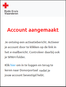 Votre compte est maintenant activé. Vous allez maintenant être redirigé vers la page d'enregistrement du portail des donateurs. Si cela ne se fait pas automatiquement, cliquez sur 'ici' dans l'écran affiché :