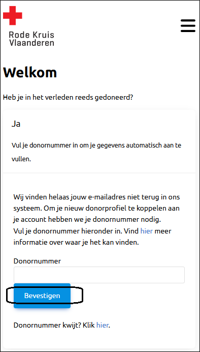 Avez-vous choisi 'Oui' ? Pour vous relier à votre profil existant, nous avons besoin de votre numéro de donateur nécessaire. Chaque donateur qui a déjà fait un don à la Rode Kruis-Vlaanderen possède un tel numéro de donateur. Vous le trouverez au bas de chaque bulletin d'information numérique et sur votre carte de donateur post-don que vous recevez après chaque don. Vous pouvez également demander votre numéro de donateur via bloed@rodekruis.be