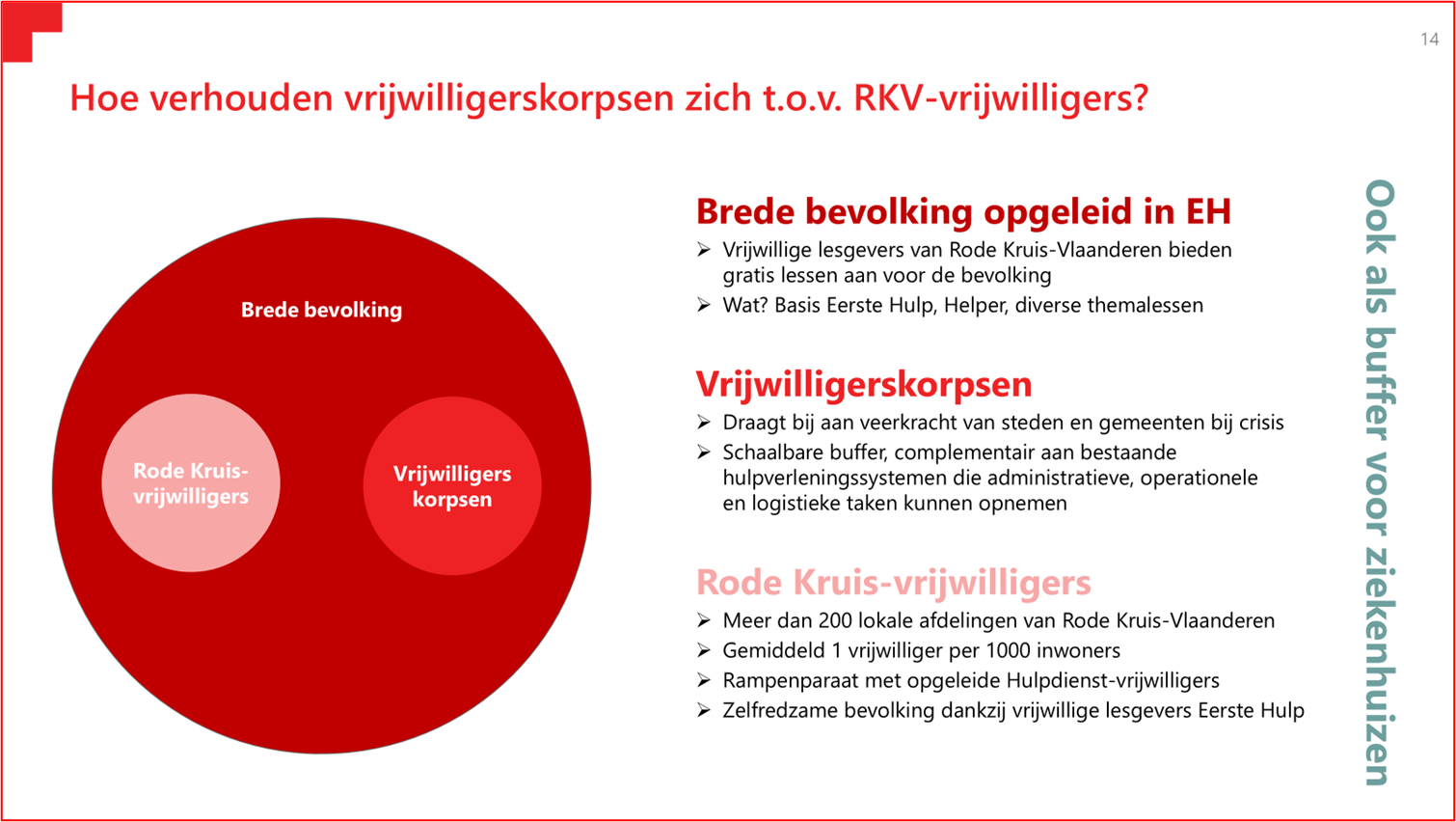 Les corps de volontaires peuvent constituer un complément précieux à nos opérations régulières en temps de crise. Les volontaires des corps de volontaires sont donc complémentaires des services d'urgence habituels et ne se substituent jamais à eux. Ils accomplissent des tâches complémentaires et ne marchent donc pas aux côtés des volontaires de la Croix-Rouge. Ils marchent aux côtés des autres disciplines. Ils ne seront jamais mélangés. Chacune a ses propres tâches et sa propre direction. Alors que les volontaires du Corps fournissent l'assistance la plus pratique (administrative, logistique, opérationnelle), les volontaires de la Croix-Rouge peuvent se concentrer sur les tâches plus spécialisées pour lesquelles ils ont été formés.